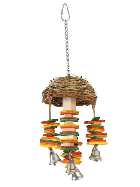 Encourage your feathered friend to egg-ercise when you hang Caitec Paradise’s Basket Twister Bird Toy in his cage. There’s something at every level to capture his attention. At the top, he’ll find a shreddable bamboo basket that meets his natural instinct to forage. Hanging below, he’ll discover the colorful blocks that encourage preening and beak conditioning. And when he reaches the bottom, he’ll be rewarded with a delightful ding from the hanging bells. With a sturdy stainless steel chain and pear clip, it installs quickly and can be moved around easily.