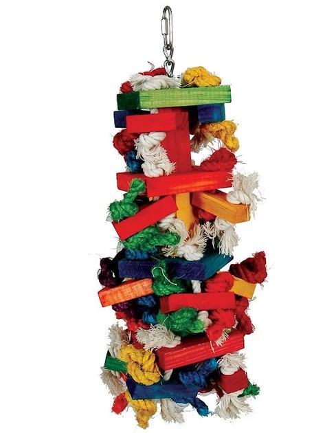 - Bright blocks and an abundance of rope knots capture your feather friend’s attention.