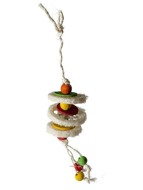 With so much to explore, there’s plenty of fun Caitec Paradise’s Loofa Triple Stacks Bird Toy to keep him occupied around the clock. Loofa disks, beads, knotted rope and wood provide a variety of textures and shapes that need exploring. The intriguing combination encourages preening and beak conditioning, two behaviors that help keep him healthy. As he’s busy playing and exercising, he’ll be too distracted to continue any destructive behavior.