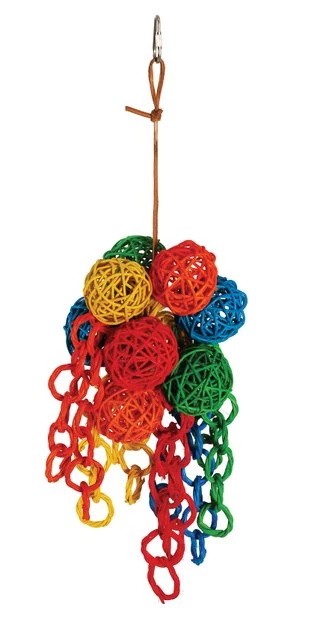 The Caitec Featherland Paradise Vibrant Clusters Bird Toy is a cheery addition to your winged companion’s cage! Designed to keep him active, it promotes exercise, exploration and healthy, instinctual behaviors like chewing. Your feathered friend is sure to be fascinated with the distinctive shapes and vibrant colors, while the unique individual textures encourage preening and beak conditioning. It’s easy to hang just about anywhere in his habit using the strong stainless steel pear link and is a great way to keep your beaked bestie from being bored.