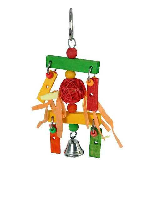 Caitec Paradise Windchime Bird Toy is a real winger with a combination of his favorite colors and textures. As he exercises and plays on this busy toy, he’ll be rewarded with the bell ringing at the bottom. He’ll explore all the different pieces with his mouth to satisfy his need to chew, preen and condition his beak. As he’s busy playing, he won’t have time to be destructive elsewhere in his cage. This toy hangs with a pear clip for quick installation and easy rearranging around his home.
