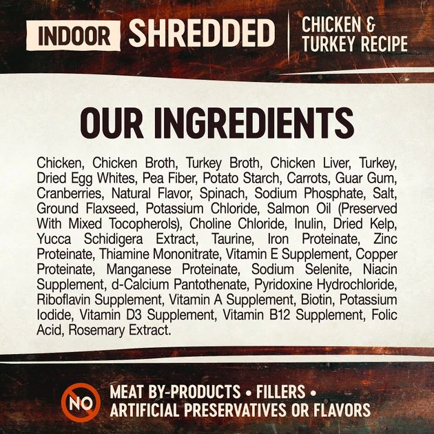Chicken, Chicken Broth, Turkey Broth, Chicken Liver, Turkey, Dried Egg Whites, Pea Fiber, Potato Starch, Carrots, Guar Gum, Cranberries, Natural Flavor, Spinach, Sodium Phosphate, Salt, Ground Flaxseed, Potassium Chloride, Salmon Oil (Preserved with Mixed Tocopherols), Choline Chloride, Inulin, Dried Kelp, Yucca Schidigera Extract, Taurine, Iron Proteinate, Zinc Proteinate, Thiamine Mononitrate, Vitamin E Supplement, Copper Proteinate, Manganese Proteinate, Sodium Selenite, Niacin Supplement, D-Calcium Pantothenate, Pyridoxine Hydrochloride, Riboflavin Supplement, Vitamin A Supplement, Biotin, Potassium Iodide, Vitamin D3 Supplement, Vitamin B12 Supplement, Folic Acid, Rosemary Extract.