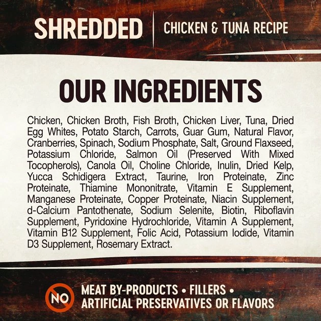 Chicken, Chicken Broth, Fish Broth, Chicken Liver, Tuna, Dried Egg Whites, Potato Starch, Carrots, Guar Gum, Natural Flavor, Cranberries, Spinach, Sodium Phosphate, Salt, Ground Flaxseed, Potassium Chloride, Salmon Oil (Preserved With Mixed Tocopherols), Canola Oil, Choline Chloride, Inulin, Dried Kelp, Yucca Schidigera Extract, Taurine, Iron Proteinate, Zinc Proteinate, Thiamine Mononitrate, Vitamin E Supplement, Manganese Proteinate, Copper Proteinate, Niacin Supplement, d-Calcium Pantothenate, Sodium Selenite, Biotin, Riboflavin Supplement, Pyridoxine Hydrochloride, Vitamin A Supplement, Vitamin B12 Supplement, Folic Acid, Potassium Iodide, Vitamin D3 Supplement, Rosemary Extract.