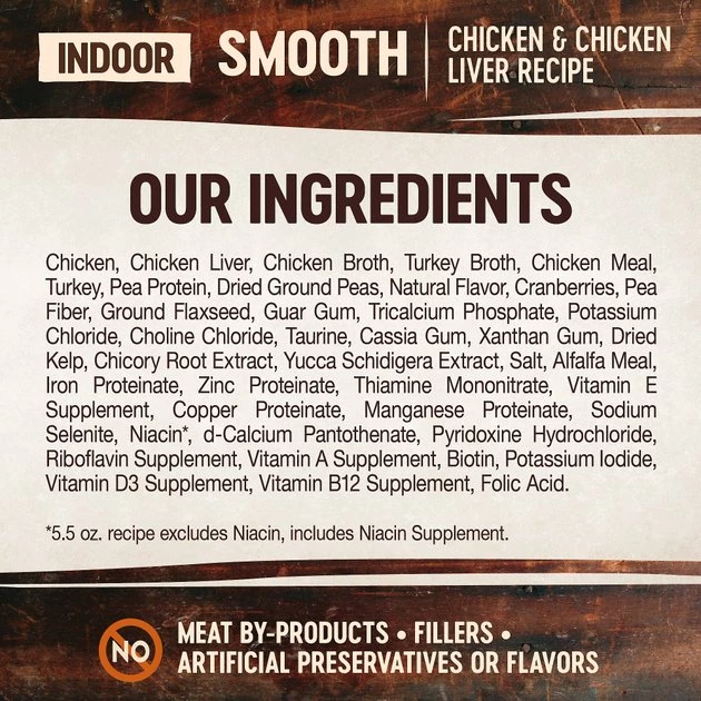 Chicken, Chicken Liver, Chicken Broth, Turkey Broth, Chicken Meal, Turkey, Pea Protein, Dried Ground Peas, Natural Flavor, Cranberries, Pea Fiber, Ground Flaxseed, Guar Gum, Tricalcium Phosphate, Potassium Chloride, Choline Chloride, Taurine, Cassia Gum, Xanthan Gum, Dried Kelp, Chicory Root Extract, Yucca Schidigera Extract, Salt, Alfalfa Meal, Iron Proteinate, Zinc Proteinate, Thiamine Mononitrate, Vitamin E Supplement, Copper Proteinate, Manganese Proteinate, Sodium Selenite, Niacin, d-Calcium Pantothenate, Pyridoxine Hydrochloride, Riboflavin Supplement, Vitamin A Supplement, Biotin, Potassium Iodide, Vitamin D3 Supplement, Vitamin B12 Supplement, Folic Acid.