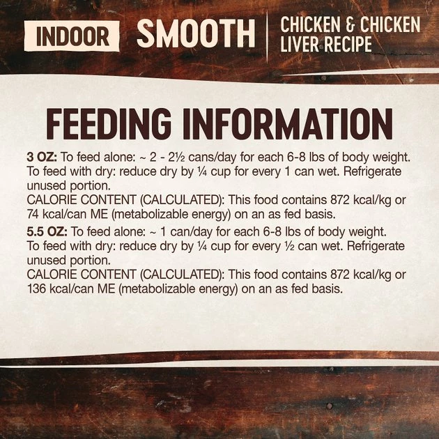 3 oz Can: 2 – 2 1/2 cans/day for each 6 – 8 lbs of body weight. To feed with dry: reduce dry by 1/4 cup for every 1/2 can wet.