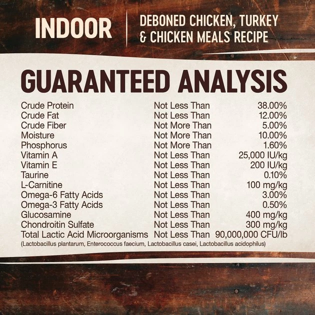 Deboned Chicken, Turkey Meal, Chicken Meal, Peas, Potatoes, Tomato Pomace, Ground Flaxseed, Chicken Fat (preserved with Mixed Tocopherols), Natural Chicken Flavor, Chicory Root Extract, Choline Chloride, Cranberries, Taurine, Vitamin E Supplement, Glucosamine Hydrochloride, Chondroitin Sulfate, Dried Kelp, L-Carnitine, Zinc Proteinate, Mixed Tocopherols added to preserve freshness, Zinc Sulfate, Calcium Carbonate, Niacin, Iron Proteinate, Ferrous Sulfate, Yucca Schidigera Extract, Vitamin A Supplement, Copper Sulfate, Thiamine Mononitrate, Copper Proteinate, Manganese Proteinate, Manganese Sulfate, d-Calcium Pantothenate, Sodium Selenite, Pyridoxine Hydrochloride, Riboflavin, Vitamin D3 Supplement, Biotin, Calcium Iodate, Vitamin B12 Supplement, Folic Acid, Ascorbic Acid (Vitamin C), Dried Lactobacillus plantarum Fermentation Product, Dried Enterococcus faecium Fermentation Product, Dried Lactobacillus casei Fermentation Product, Dried Lactobacillus acidophilus Fermentation Product, Rosemary Extract, Green Tea Extract, Spearmint Extract.