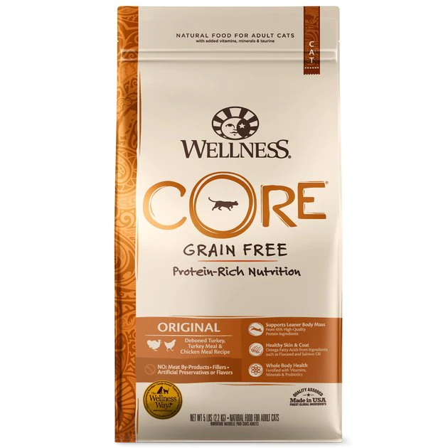 Nourish your favorite feline’s primal essence with the protein-rich nutrition of Wellness CORE Grain-Free Original Formula Dry Cat Food. With deboned turkey and deboned chicken as the first two ingredients, this nutrient-dense, grain-free recipe contains all the protein needed to help your adult cat maintain lean, powerful muscles. It’s fortified with antioxidants, omega fatty acids and probiotics to make sure his immune system, skin and coat, and gastrointestinal systems stay healthy and strong throughout his long, active life. You can be sure your furry friend is getting everything he needs to thrive from the core with this premium-quality diet that contains no wheat, fillers, or artificial ingredients.