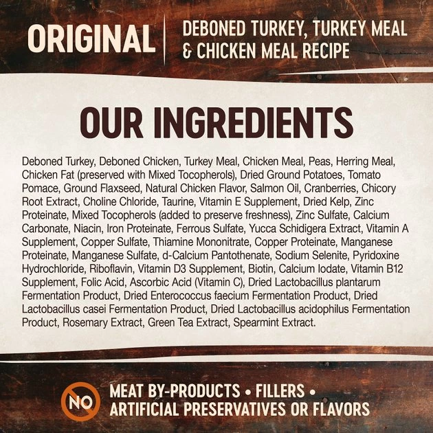 Deboned Turkey, Deboned Chicken, Turkey Meal, Chicken Meal, Peas, Herring Meal, Chicken Fat (Preserved with Mixed Tocopherols), Dried Ground Potatoes, Tomato Pomace, Ground Flaxseed, Natural Chicken Flavor, Salmon Oil, Cranberries, Chicory Root Extract, Choline Chloride, Taurine, Vitamin E Supplement, Dried Kelp, Zinc Proteinate, Mixed Tocopherols (added to preserve freshness), Zinc Sulfate, Calcium Carbonate, Niacin, Iron Proteinate, Ferrous Sulfate, Yucca Schidigera Extract, Vitamin A Supplement, Copper Sulfate, Thiamine Mononitrate, Copper Proteinate, Manganese Proteinate, Manganese Sulfate, D-Calcium Pantothenate, Sodium Selenite, Pyridoxine Hydrochloride, Riboflavin, Vitamin D3 Supplement, Biotin, Calcium Iodate, Vitamin B12 Supplement, Folic Acid, Ascorbic Acid (Vitamin C), Dried Lactobacillus Plantarum Fermentation Product, Dried Enterococcus Faecium Fermentation Product, Dried Lactobacillus Casei Fermentation Product, Dried Lactobacillus Acidophilus Fermentation Product, Rosemary Extract, Green Tea Extract, Spearmint Extract.