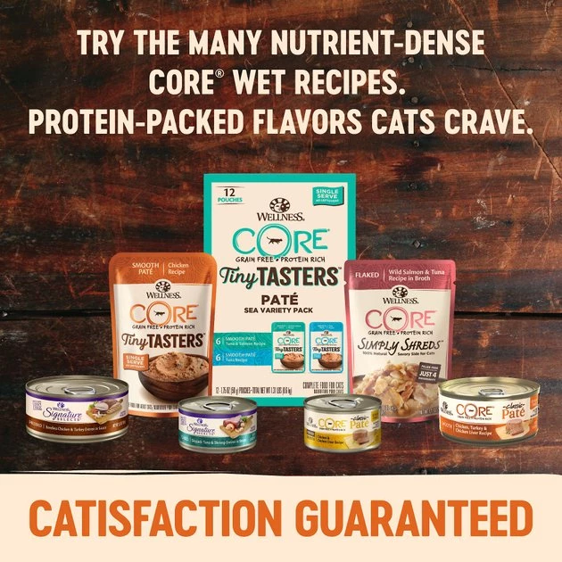 CORE is highly palatable so your cat may tend to eat more of this food. Watch initially to see if you need to adjust regular eating patterns. Give your cat access to clean, cool fresh water at all times and feed Wellness® CORE® wet food in combination whenever possible, to increase the level of water in your cat’s diet. Nutrition is the foundation of wellbeing, but be sure to give your cat plenty of love, exercise and see your veterinarian regularly!