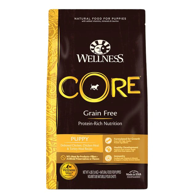 Help your furry friend grow up strong with Wellness CORE Natural Puppy Food. This grain-free dry food for puppies is formulated with chicken, turkey, salmon oil, fruits and vegetables. It is crafted in a smaller kibble size for easy eating and fortified with antioxidants, probiotics, vitamins, minerals, glucosamine, taurine and omega fatty acids—including DHA. This dry dog food is features advanced nutrition to provide a complete and balanced diet that supports healthy growth and development as well as lean body mass and muscle tone. It encourages a healthy coat and skin without any meat by-products, fillers, grain, corn, soy, wheat-gluten or artificial preservatives, colors or flavors.