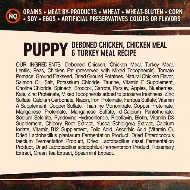 Deboned Chicken, Chicken Meal, Turkey Meal, Lentils, Peas, Chicken Fat (preserved with Mixed Tocopherols), Tomato Pomace, Ground Flaxseed, Dried Ground Potatoes, Natural Chicken Flavor, Salmon Oil, Salt, Potassium Chloride, Taurine, Vitamin E Supplement, Choline Chloride, Spinach, Broccoli, Carrots, Parsley, Apples, Blueberries, Kale, Zinc Proteinate, Mixed Tocopherols added to preserve freshness, Zinc Sulfate, Calcium Carbonate, Niacin, Iron Proteinate, Ferrous Sulfate, Vitamin A Supplement, Copper Sulfate, Thiamine Mononitrate, Copper Proteinate, Manganese Proteinate, Manganese Sulfate, d-Calcium Pantothenate, Sodium Selenite, Pyridoxine Hydrochloride, Riboflavin, Biotin, Vitamin D3 Supplement, Chicory Root Extract, Yucca Schidigera Extract, Calcium Iodate, Vitamin B12 Supplement, Folic Acid, Ascorbic Acid (Vitamin C), Dried Lactobacillus plantarum Fermentation Product, Dried Enterococcus faecium Fermentation Product, Dried Lactobacillus casei Fermentation Product, Dried Lactobacillus acidophilus Fermentation Product, Rosemary Extract, Green Tea Extract, Spearmint Extract.