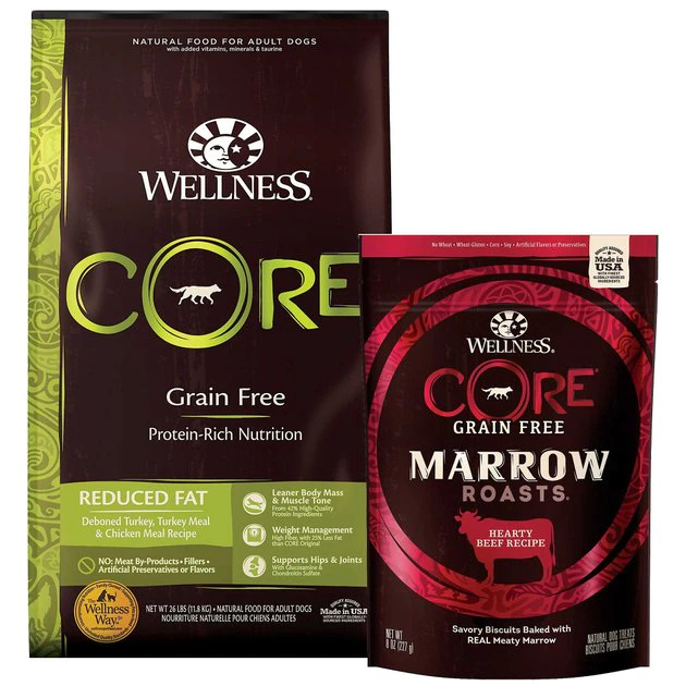 Help your mate shed some weight with Wellness CORE Grain-Free Reduced Fat Formula Dry Dog Food + Marrow Roasts Hearty Beef Recipe Dog Treats. The nutrient-rich, grain-free dry dog food is designed to encourage lean body mass and muscle tone, support a healthy coat and skin, and promote whole body health. It is developed without any meat by-products, fillers, corn, soy, wheat-gluten or artificial preservatives, colors or flavors so you can be sure Rover is always getting the right food. Plus, the crunchy dog treats are baked with real marrow centers. These tasty and tantalizing treats have a delicious center that’s packed with vitamins and minerals. Pups can’t keep their paws off of them!