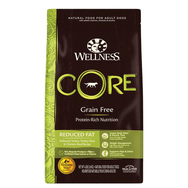 Help your mate shed some weight with Wellness CORE Natural Reduced Fat Dog Food. This balanced, grain-free dry food for dogs is specially formulated to help your dog maintain a healthy weight using the power of protein and a reduced fat recipe. It is crafted using carefully chosen ingredients that include premium proteins—like turkey, chicken and salmon oil—as well as fruits, vegetables and wholesome grains fortified with omega fatty acids, antioxidants, glucosamine, probiotics, taurine, vitamins and minerals. This nutrient-rich, grain-free dry dog food is designed to encourage lean body mass and muscle tone, support a healthy coat and skin, and promote whole body health. It is developed without any meat by-products, fillers, corn, soy, wheat-gluten or artificial preservatives, colors or flavors so you can be sure Rover is always getting the right food.