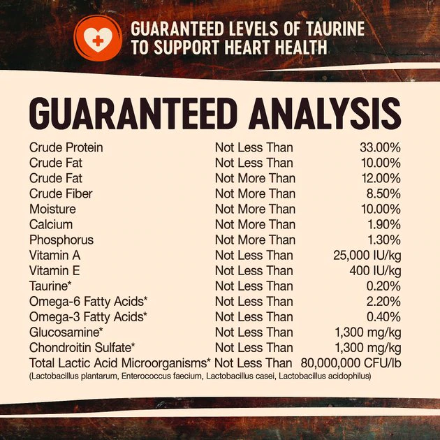 - Fortified with omega fatty acids, antioxidants, glucosamine, probiotics, taurine, vitamins and minerals.