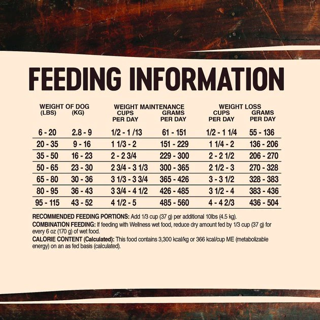 This food is formulated for adult, non-reproducing dogs over one year old as puppies and pregnant or nursing mothers have special nutritional requirements. It is important to slowly transition your dog from his/her current diet as it takes a few days for the body to adapt to new nutrient levels. To transition, gradually mix in the new food over a 5 – 7 day period, increasing the amount of Wellness® each day, so that you are feeding 100% Wellness® CORE® by day 7.