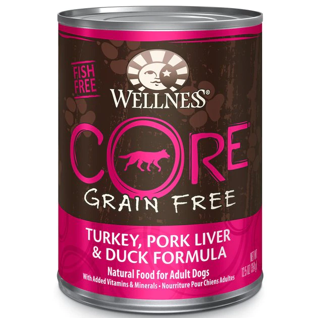 Serve your fuzzy friend a flavor he can savor with Wellness CORE Natural Turkey, Pork & Duck. This grain-free, canned wet food for dogs is packed with premium protein as well as a proprietary blend of botanicals and nutritional supplements. It is crafted to provide a complete and balanced diet with added essential vitamins and minerals. This grain-free wet dog food is made using only premium, all-natural ingredients and does not contain any wheat, corn, soy, meat by-products or artificial colors, flavors and preservatives.