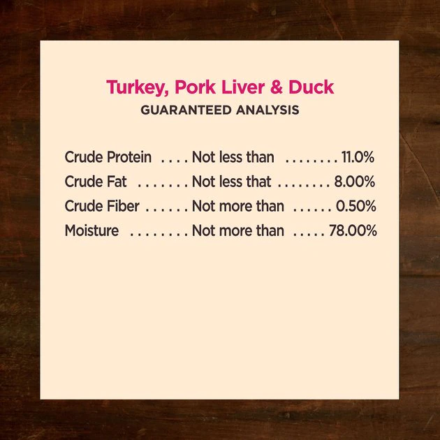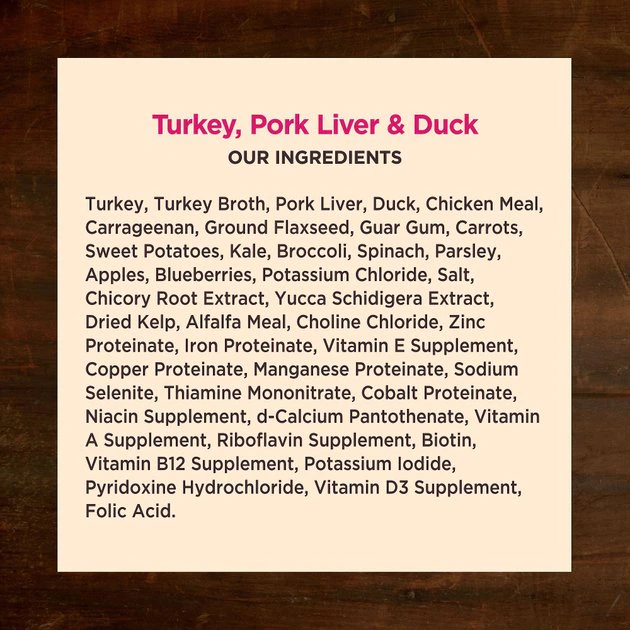 Turkey, Turkey Broth, Pork Liver, Duck, Chicken Meal, Ground Flaxseed, Carrageenan, Guar Gum, Carrots, Sweet Potatoes, Kale, Broccoli, Spinach, Parsley, Apples, Blueberries, Salt, Potassium Chloride, Chicory Root Extract, Yucca Schidigera Extract, Dried Kelp, Alfalfa Meal, Choline Chloride, Zinc Proteinate, Iron Proteinate, Vitamin E Supplement, Copper Proteinate, Manganese Proteinate, Sodium Selenite, Thiamine Mononitrate, Cobalt Proteinate, Niacin Supplement, d-Calcium Pantothenate, Vitamin A Supplement, Riboflavin Supplement, Biotin, Vitamin B12 Supplement, Potassium Iodide, Pyridoxine Hydrochloride, Vitamin D3 Supplement, Folic Acid.