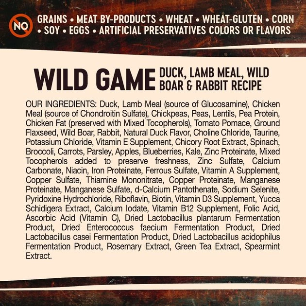 Duck, Lamb Meal (source of Glucosamine), Chickpeas, Chicken Meal (source of Chondroitin Sulfate), Peas, Lentils, Pea Protein, Chicken Fat (preserved with Mixed Tocopherols), Tomato Pomace, Ground Flaxseed, Wild Boar, Rabbit, Natural Duck Flavor, Choline Chloride, Taurine, Potassium Chloride, Vitamin E Supplement, Chicory Root Extract, Spinach, Broccoli, Carrots, Parsley, Apples, Blueberries, Kale, Zinc Proteinate, Mixed Tocopherols added to preserve freshness, Zinc Sulfate, Calcium Carbonate, Niacin, Iron Proteinate, Ferrous Sulfate, Vitamin A Supplement, Copper Sulfate, Thiamine Mononitrate, Copper Proteinate, Manganese Proteinate, Manganese Sulfate, d-Calcium Pantothenate, Sodium Selenite, Pyridoxine Hydrochloride, Riboflavin, Biotin, Vitamin D3 Supplement, Yucca Schidigera Extract, Calcium Iodate, Vitamin B12 Supplement, Folic Acid, Ascorbic Acid (Vitamin C), Dried Lactobacillus plantarum Fermentation Product, Dried Enterococcus faecium Fermentation Product, Dried Lactobacillus casei Fermentation Product, Dried Lactobacillus acidophilus Fermentation Product, Rosemary Extract, Green Tea Extract, Spearmint Extract.