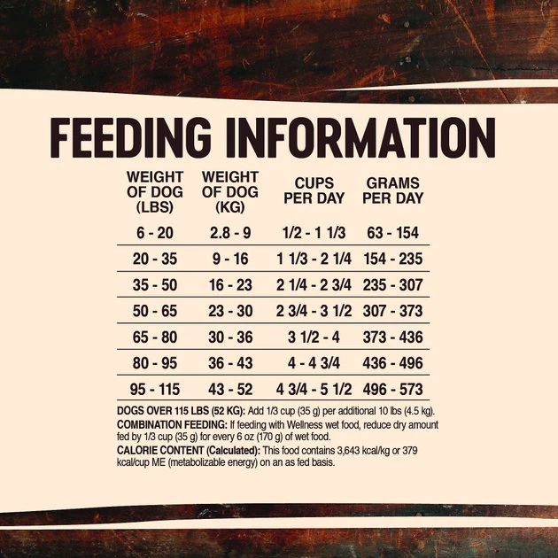 This food is formulated for adult, non-reproducing dogs over one year old as puppies and pregnant or nursing mothers have special nutritional requirements. It is important to slowly transition your dog from his/her current diet as it takes a few days for the body to adapt to new nutrient levels. To transition, gradually mix in the new food over a 5 – 7 day period, increasing the amount of Wellness® each day, so that you are feeding 100% Wellness® CORE® by day 7.
