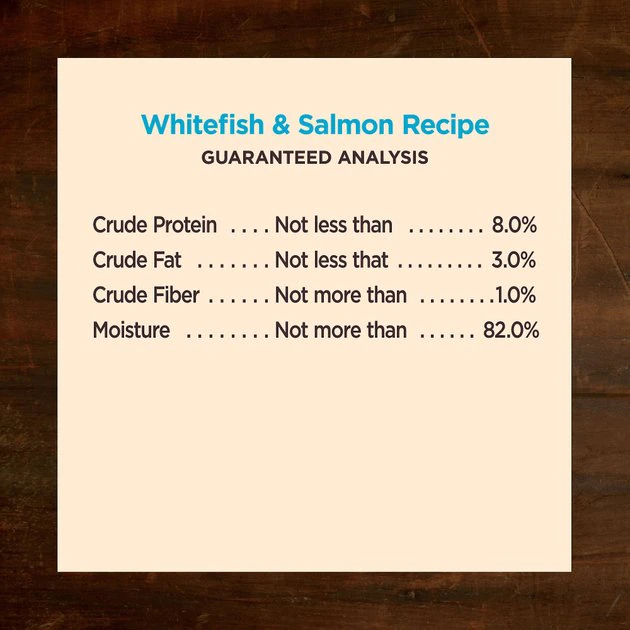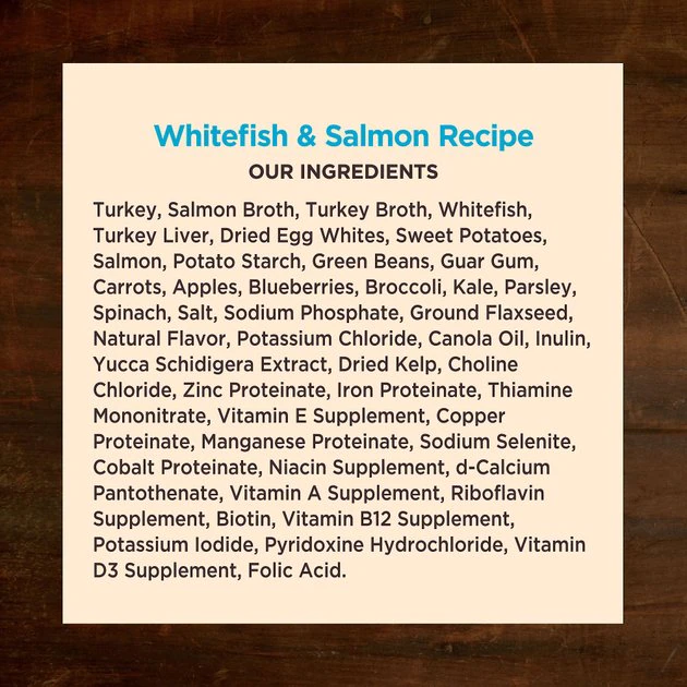 Turkey, Salmon Broth, Turkey Broth, Whitefish, Turkey Liver, Dried Egg Whites, Sweet Potatoes, Potato Starch, Salmon, Green Beans, Guar Gum, Carrots, Apples, Blueberries, Broccoli, Kale, Parsley, Spinach, Salt, Sodium Phosphate, Ground Flaxseed, Natural Flavor, Potassium Chloride, Canola Oil, Inulin, Yucca Schidigera Extract, Dried Kelp, Choline Chloride, Zinc Proteinate, Iron Proteinate, Thiamine Mononitrate, Vitamin E Supplement, Copper Proteinate, Manganese Proteinate, Sodium Selenite, Cobalt Proteinate, Niacin Supplement, d-Calcium Pantothenate, Vitamin A Supplement, Riboflavin Supplement, Biotin, Vitamin B12 Supplement, Potassium Iodide, Pyridoxine Hydrochloride, Vitamin D3 Supplement, Folic Acid.