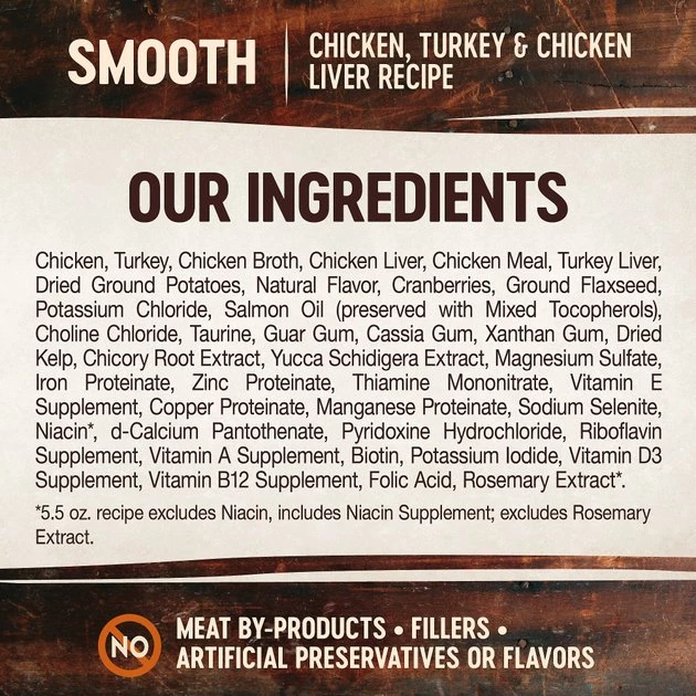 Chicken, Turkey, Chicken Broth, Chicken Liver, Chicken Meal, Turkey Liver, Dried Ground Potatoes, Natural Flavor, Cranberries, Guar Gum, Ground Flaxseed, Potassium Chloride, Salmon Oil (preserved with Mixed Tocopherols), Choline Chloride, Taurine, Cassia Gum, Xanthan Gum, Dried Kelp, Chicory Root Extract, Yucca Schidigera Extract, Magnesium Sulfate, Iron Proteinate, Zinc Proteinate, Thiamine Mononitrate, Vitamin E Supplement, Copper Proteinate, Manganese Proteinate, Sodium Selenite, Niacin, d-Calcium Pantothenate, Pyridoxine Hydrochloride, Riboflavin Supplement, Vitamin A Supplement, Biotin, Potassium Iodide, Vitamin D3 Supplement, Vitamin B12 Supplement, Folic Acid, Rosemary Extract.