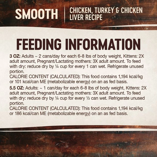 For adults, feed about 2 cans/day for each 6-8 lbs of body weight. Kittens: 2X adult amount. For pregnant/lactating mothers, feed 3X adult amount. To feed with dry, reduce dry by ¼ cup for every 1 can wet. Refrigerate unused portion.