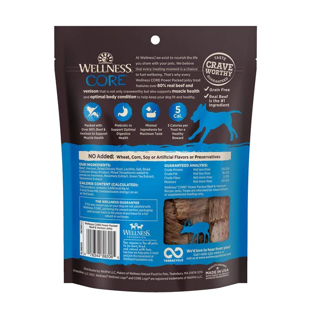 Wellness CORE Power Packed Grain-Free Venison Jerky Bites are a hearty lean snack made with real venison. This yummy treat is free from meat by-products, artificial colors and artificial flavors. With a bold natural taste and big on nutrition pups all around give Wellness Jerky Bites two paws up! Each tender nugget contains minimal ingredients and is packed with protein, perfect for training.