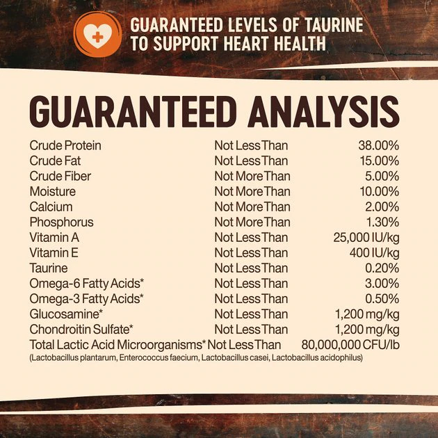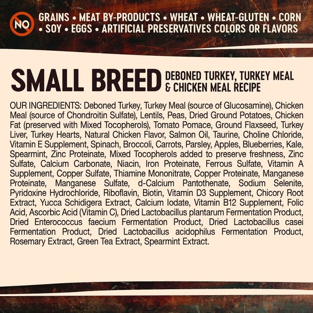 Deboned Turkey, Turkey Meal (source of Glucosamine), Chicken Meal (source of Chondroitin Sulfate), Lentils, Peas, Dried Ground Potatoes, Chicken Fat (preserved with Mixed Tocopherols), Tomato Pomace, Ground Flaxseed, Turkey Liver, Turkey Hearts, Natural Chicken Flavor, Salmon Oil, Taurine, Choline Chloride, Vitamin E Supplement, Spinach, Broccoli, Carrots, Parsley, Apples, Blueberries, Kale, Spearmint, Zinc Proteinate, Mixed Tocopherols added to preserve freshness, Zinc Sulfate, Calcium Carbonate, Niacin, Iron Proteinate, Ferrous Sulfate, Vitamin A Supplement, Copper Sulfate, Thiamine Mononitrate, Copper Proteinate, Manganese Proteinate, Manganese Sulfate, d-Calcium Pantothenate, Sodium Selenite, Pyridoxine Hydrochloride, Riboflavin, Biotin, Vitamin D3 Supplement, Chicory Root Extract, Yucca Schidigera Extract, Calcium Iodate, Vitamin B12 Supplement, Folic Acid, Ascorbic Acid (Vitamin C), Dried Lactobacillus plantarum Fermentation Product, Dried Enterococcus faecium Fermentation Product, Dried Lactobacillus casei Fermentation Product, Dried Lactobacillus acidophilus Fermentation Product, Rosemary Extract, Green Tea Extract, Spearmint Extract.