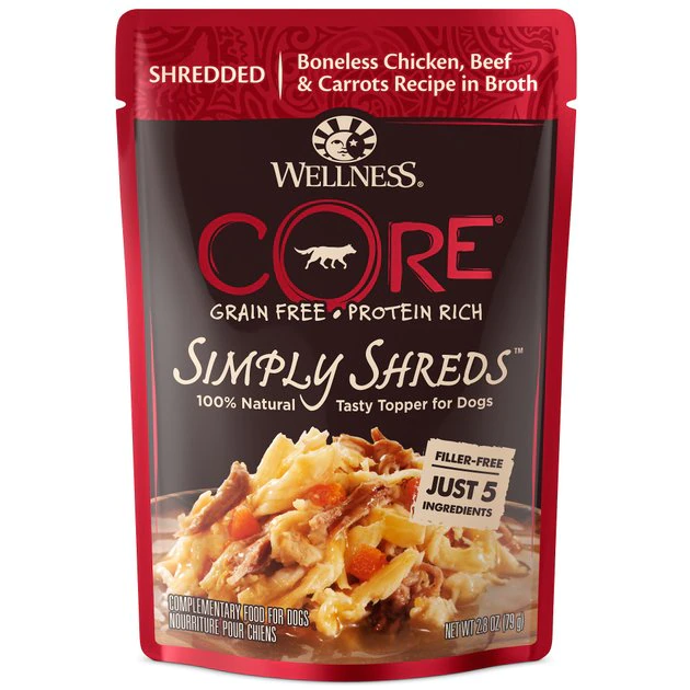 Reward Rover with Wellness CORE Simply Shreds Chicken, Beef & Carrots. This natural, grain-free wet food mixer or topper is crafted using minimal ingredients because sometimes less is more! It features meaty shreds of premium protein combined with nutrient-rich diced veggies in a rich broth. This wet dog food mixer or topper is ideal for dogs with food sensitivities and does not contain any meat by-products, wheat, corn, soy, artificial preservatives, colors or flavors. It is packaged in easy to serve container for your convenience.