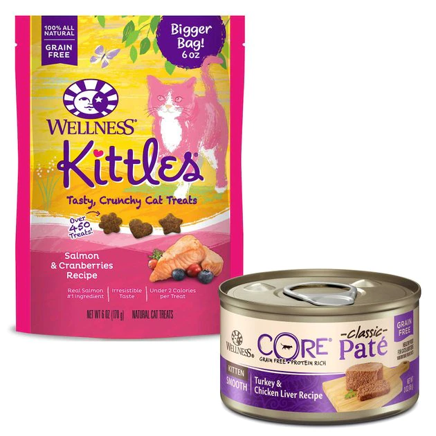 Wellness Kittles Grain-Free Salmon & Cranberries Recipe Crunchy Cat Treats + Wellness CORE Natural Grain Free Turkey & Chicken Liver Pate Canned Kitten Food offers a protein-focused diet to give your kitten the energy she needs to thrive. Your feline friend will go head-over-paws for the delicious, all-natural, crunchy treats made with nutritious ingredients like salmon, cranberries, and blueberries. These “berry” tasty treats are less than two calories each and contain no artificial ingredients, so both you and your cat can feel good about giving and getting them! Plus, the specially developed canned food contains added DHA to help support healthy brain and eye development in growing kittens. Each recipe is made without the use of carrageenan, artificial colors, flavors or preservatives—just wholesome ingredients for a nutritious meal.